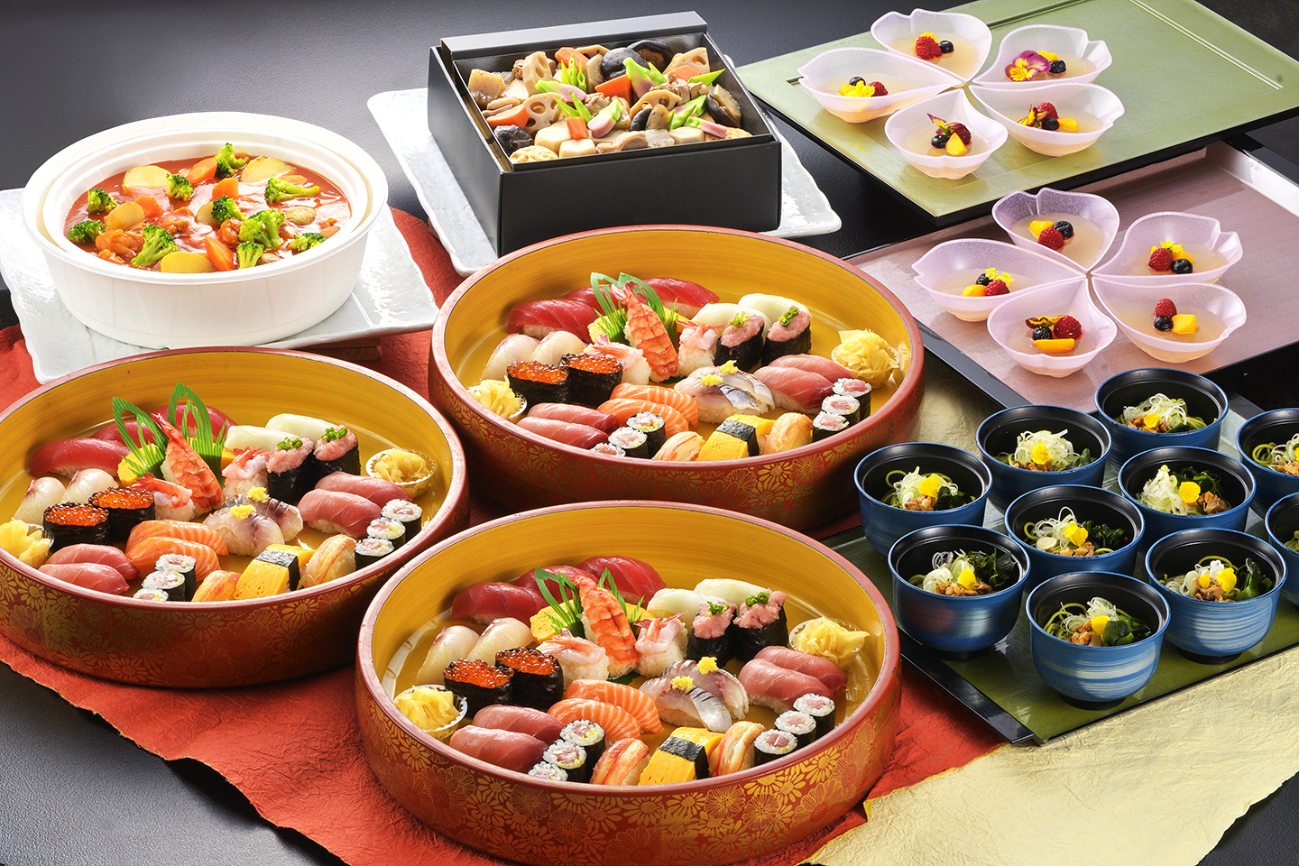 鮪1本造り、ローストビーフカット、手巻き寿司、握り寿司、揚げたて天プラ・フライ、温かい点心(セイロ蒸し)等ご相談下さい。